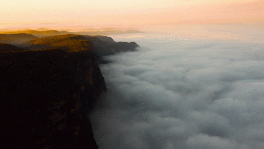 A drone hyperlapse capturing majestic fog crashing into sandstone cliffs at sunrise in The Blue Mountains, Australia.
