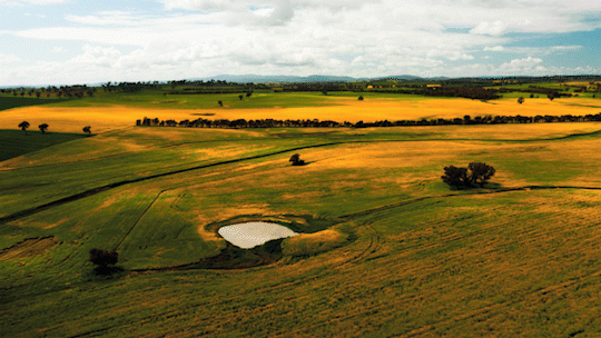A drone hyperlapse capturing midday cloud shadows rolling over fields of golden canola flowers in central New South Wales, Australia.
