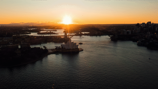 A drone hyperlapse capturing Sydney Harbour’s famous bridge and Opera House at sunset.